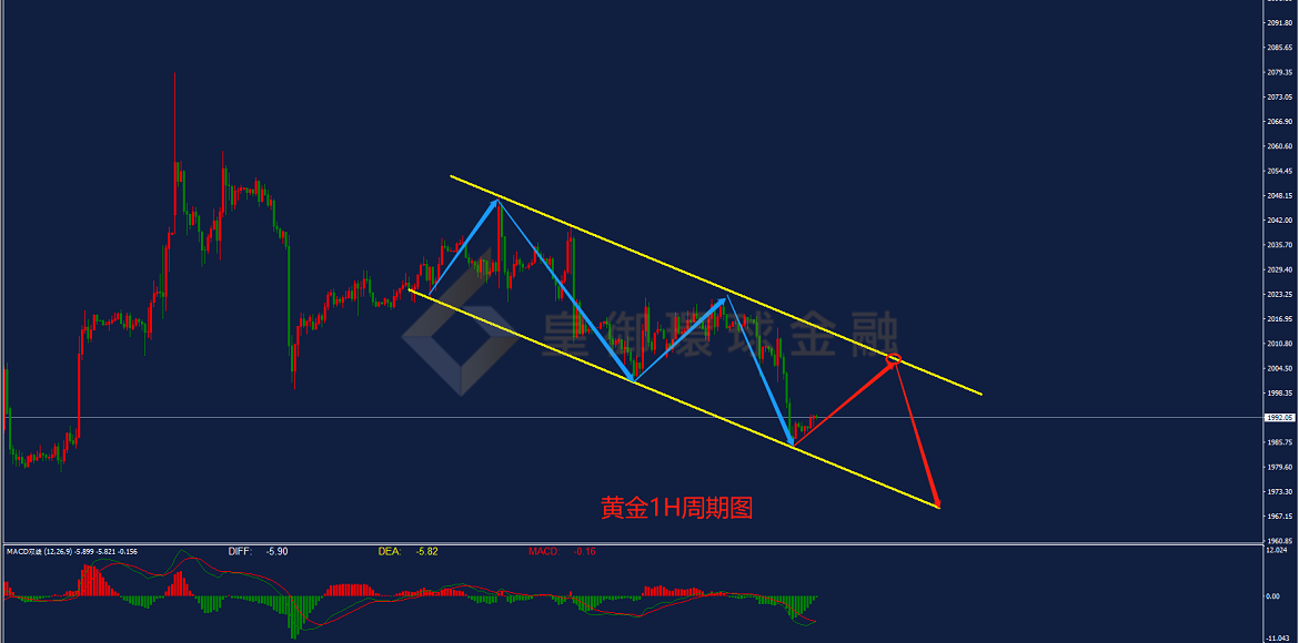 从下图的黄金1小时周期图来看,黄金于近期迎来延续下跌,走出高低点逐渐下移的下跌形态,并构建下跌通道,行情于通道内震荡下行。昨日晚间,黄金再度下破,当前受到通道底部支撑后迎来调整。从指标上来看,MACD指标的DIFF与DEA双线即将于0轴下方迎来金叉,预计行情即将迎来下跌趋势中的反弹段,日内操作建议可等待行情反弹后进行高空,可于通道顶部压力2010一线进行入场。